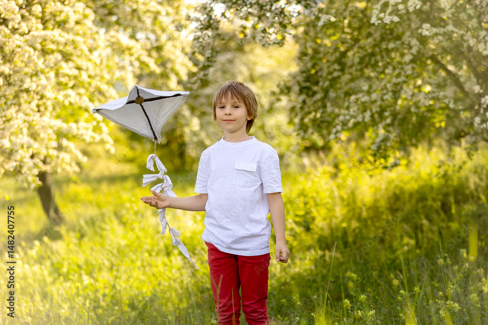 Beautiful blond child, boy, eating strawberries and gathering flowers