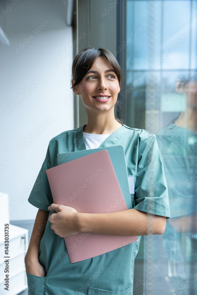 Smiling dark-haired female doctor in lab coat with a medical history in hands