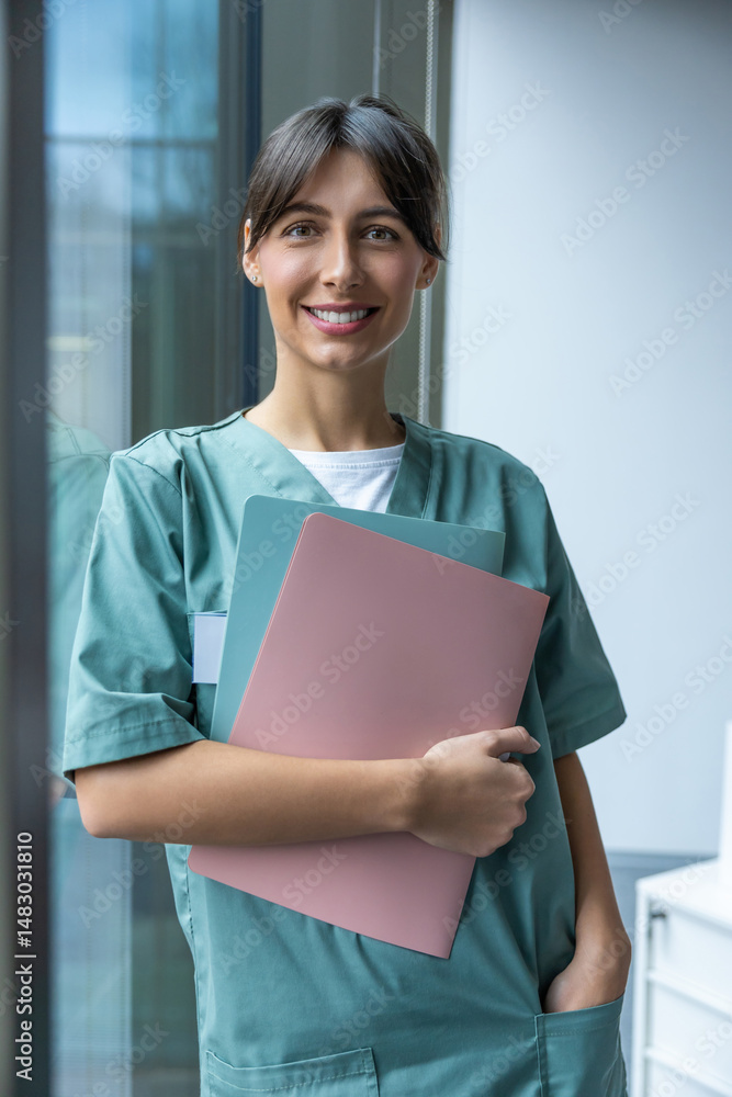 Smiling dark-haired female doctor in lab coat with a medical history in hands