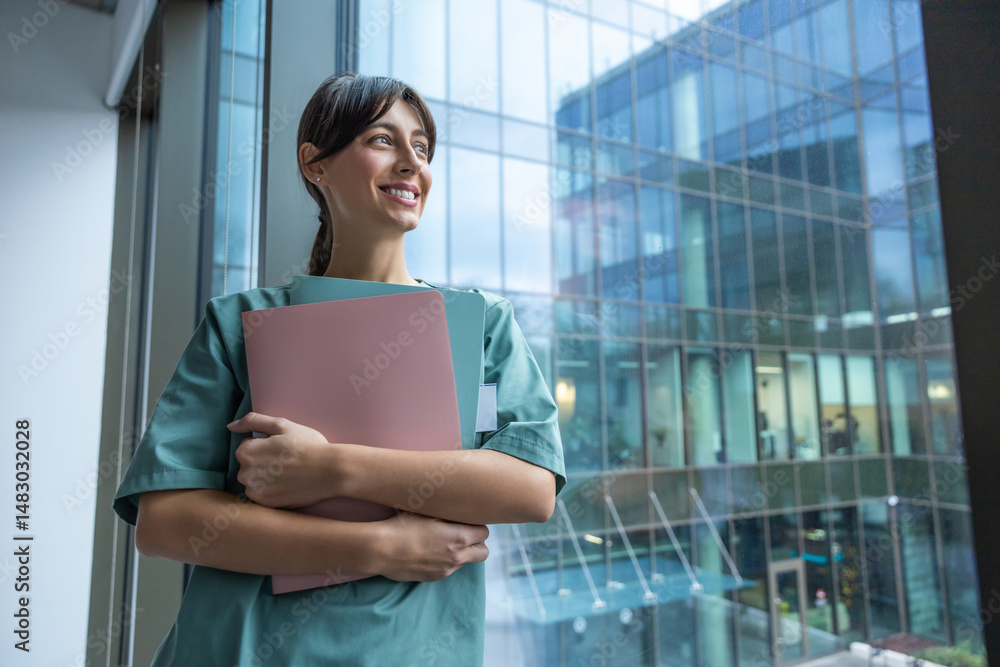 Smiling dark-haired female doctor in lab coat with a medical history in hands