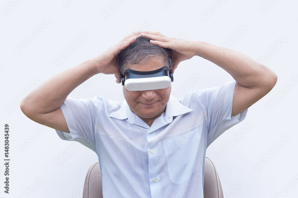 Old asian man wearing VR headsets, using a laptop and headphones, eagerly learning new technology