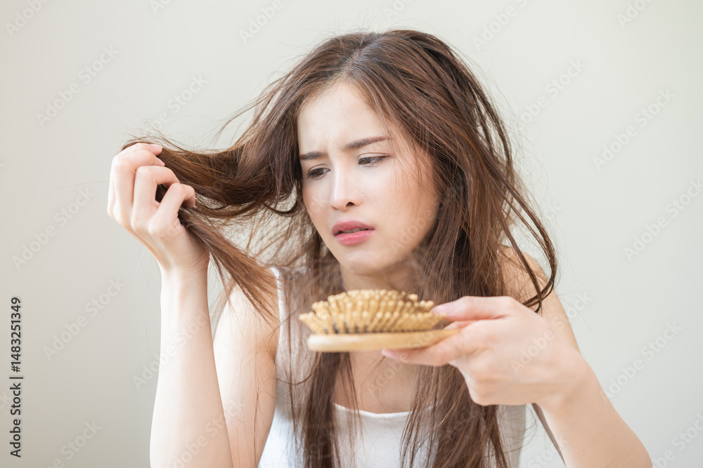 Damaged hair, amazed asian young woman, girl hand holding brush comb, hairbrush with fall hair from scalp after brushing, face worry about balding. Health care, beauty treatment, hair loss problem.