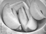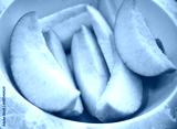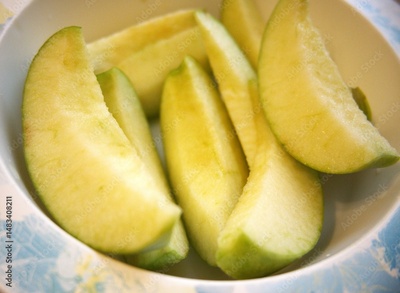 Slices of green apple in small bowl close up.