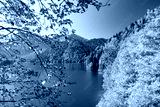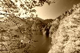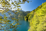 Beautiful view through tree branches on the famous lake Ritsa in the mountains of Abkhazia on a warm sunny day. Autumn warm day