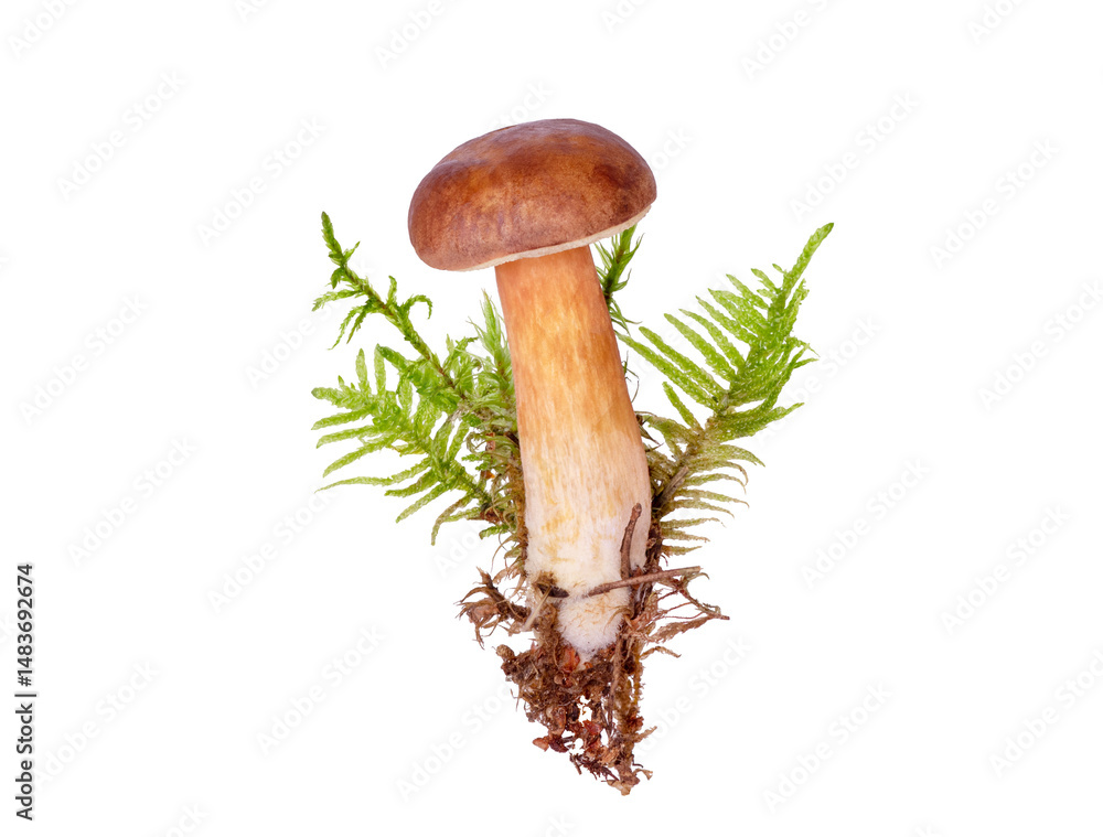 Forest mushroom with green moss isolate on a white background
