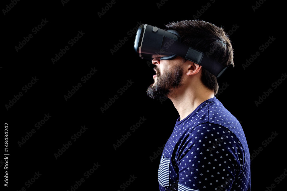 Man in blue dotted T-shirt wearing virtual reality 3d-headset