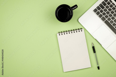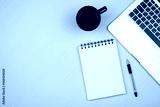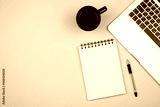 Modern office desk table with laptop, blank notebook page