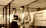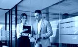Executives team of two business people working talking using tablet tech walking in corporate office. Happy professional smiling businessman and businesswoman having conversation at work. Candid photo