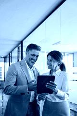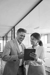 Vertical photo of happy busy mature professional business people, two happy business man and woman executives partners team working together walking in office using digital tablet and talking.