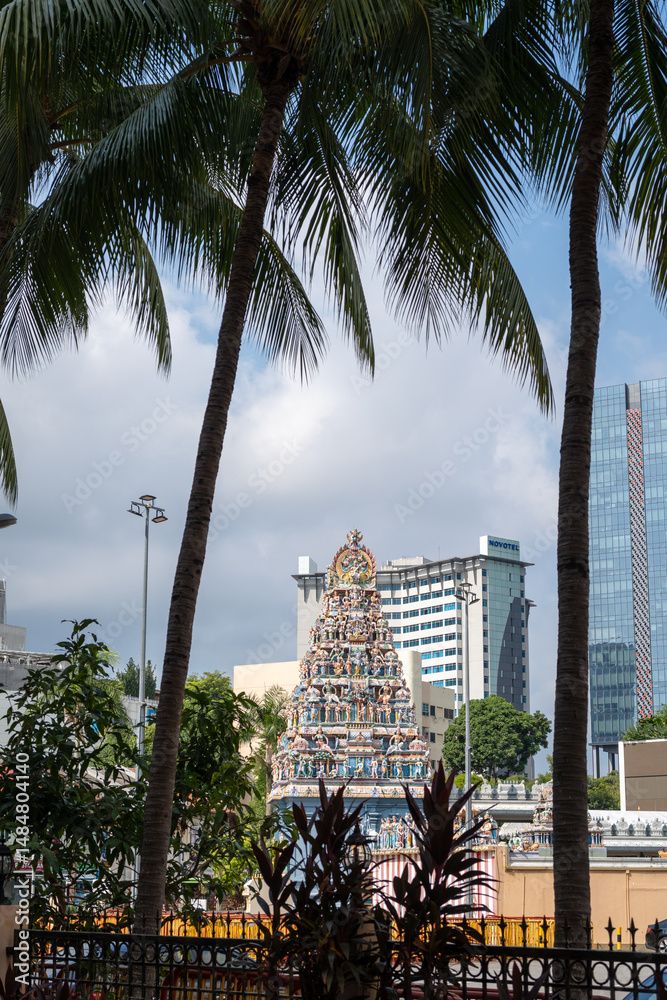 Sri Srinivasa Perumal Temple surrounded by buildings and palm trees in Singapore