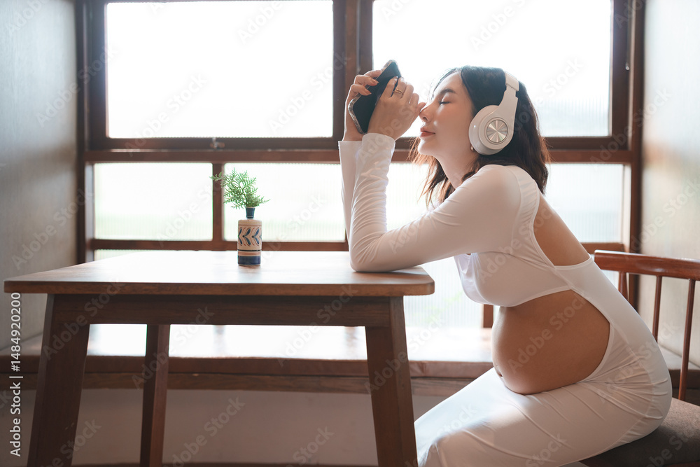 Pregnant woman enjoying music at home indoor setting lifestyle photography relaxed atmosphere