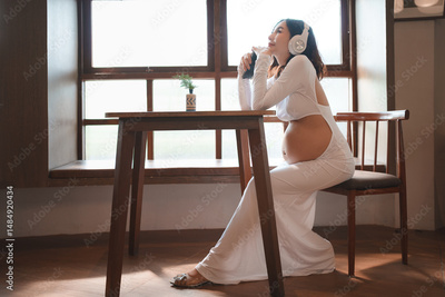 Pregnant woman in white dress listening to music at home relaxed atmosphere natural light