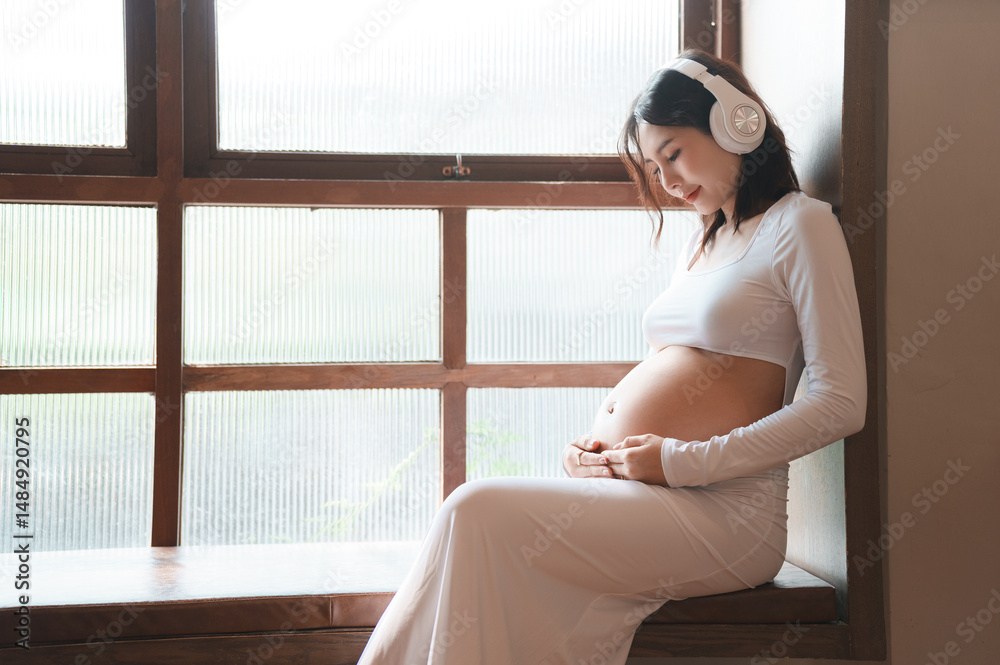 Pregnant woman listening to music in cozy home setting tranquil atmosphere intimate moment