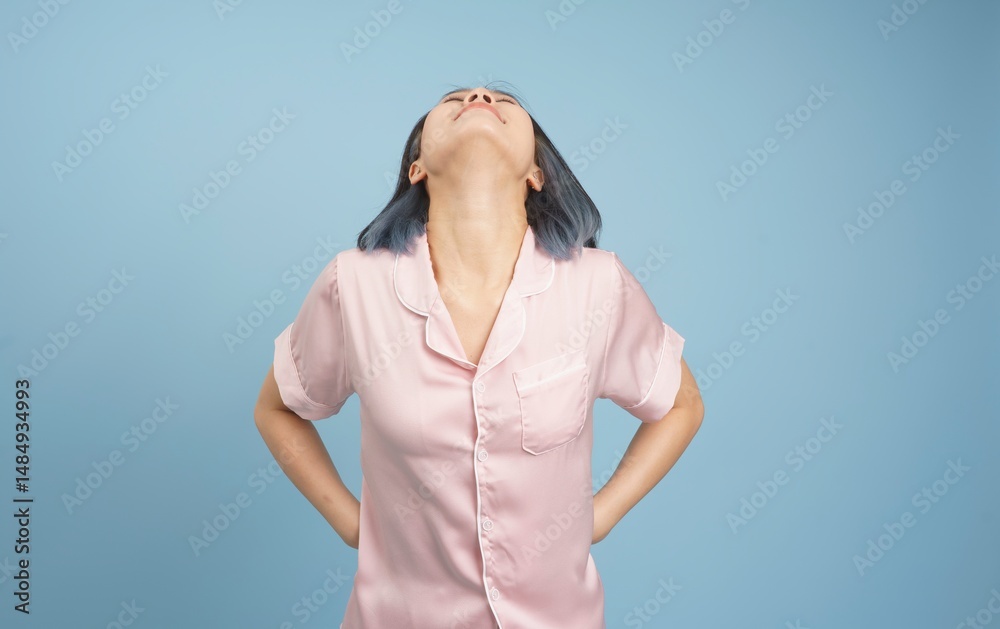 Young woman in pink pajamas poses against a blue background with hands on hips and head tilted back