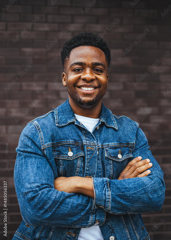 Confident Young Man Smiling Outdoors in Casual Denim Jacket