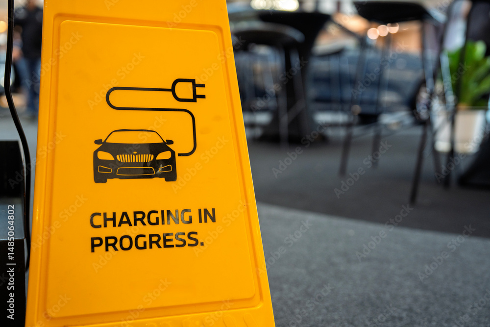 A bright yellow caution sign with a black illustration of a car and plug, indicating "Charging in Progress" at an electric vehicle charging station.