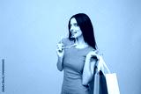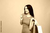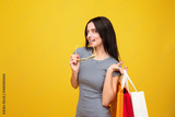 Fashionable young woman in a striped dress posing playfully with shopping bags against a vibrant yellow backdrop, embodying trendy style, carefree attitude, and shopping enthusiasm.