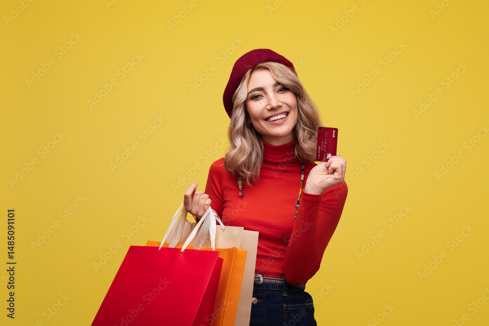 A cheerful woman with shopping bags and a credit card, showcasing a joyful shopping experience. The image conveys excitement, modern lifestyle, and positive energy in a bright and colorful environment