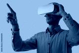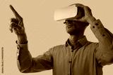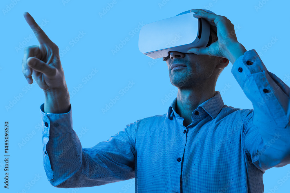 A man explores immersive virtual reality technology in a dynamic environment, interacting seamlessly with simulated digital interfaces for innovative applications.