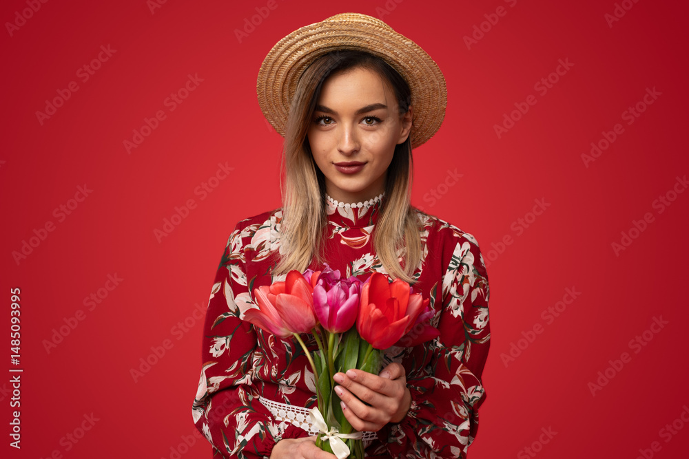Pretty young female in stylish outfit and hat holding bouquet of tulips and looking at camera while standing on red background