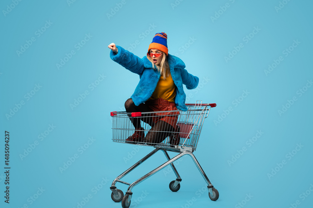 Side view of crazy trendy young female in bright clothes holding paper bags and riding shopping cart in superhero pose against blue background