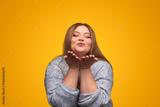 Lovely plump lady in casual outfit smiling sending virtual kisses on yellow background