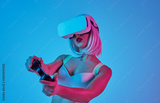 Self assured young woman with blond hair and red lips playing video game with joystick in modern VR headset in blue neon studio