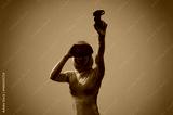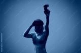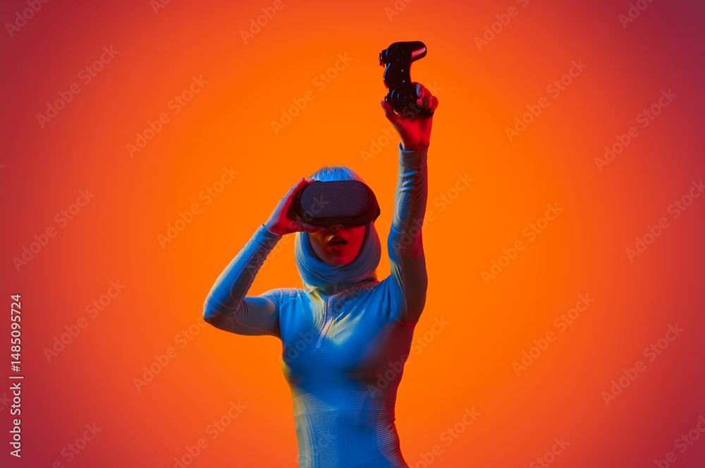 Attentive young futuristic woman in wig and VR glasses playing videogame while standing against bright orange background with gamepad in raised hand