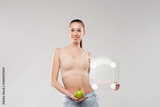 Smiling young woman holding a weight scale and green apple, symbolizing health, fitness, and healthy habits, emphasizing lifestyle choices focused on wellness, diet, and exercise.