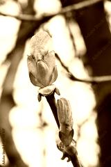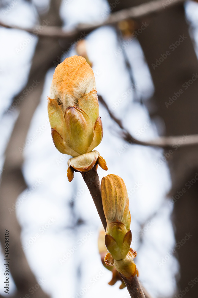 Chestnut tree twig, macro view branch buds, first leaves. Springtime park still life photo. Shallow depth field, soft focus.