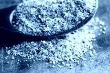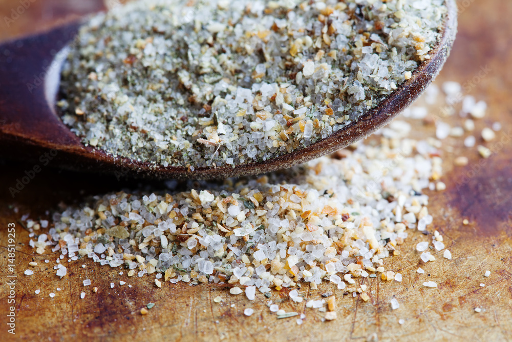 Garlic salt macro view. Mineral saline sodium chloride organic food condiment in wooden spoon, aged rusty background. Shallow depth field.