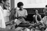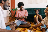 Happy family playing a fun card game in their living room