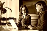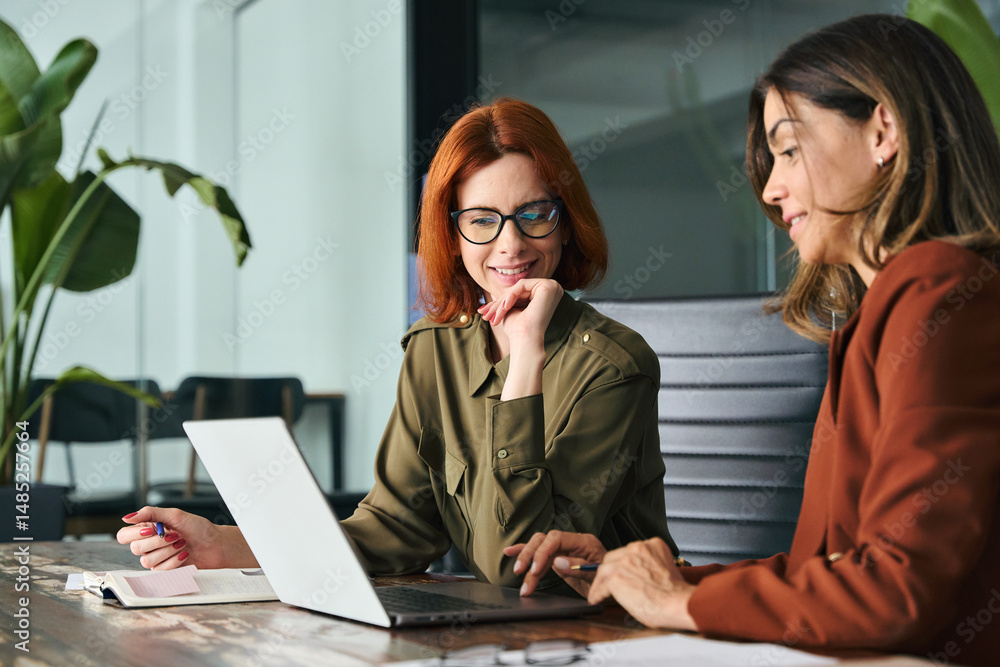 Two happy busy diverse women working together using computer at desk in office. Female coworkers , smiling busy professional businesswomen looking at laptop discussing sales project plan in office.