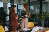 Candid photo of two happy busy business women talking using tab working together standing in office. Smiling professional female employees team having friendly conversation at work.
