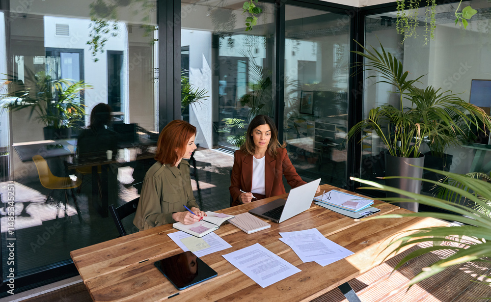 Professional ladies employee and manager having conversation looking at laptop at work. Two busy happy business women of young and middle age talking in green office sitting at desk. Top above view