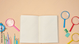 Top view of an open notebook with pastel-colored pencils, green sharpener, and turquoise eraser on a beige background.