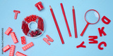 Flat lay of red stationery, learning items letters, magnifying glass, supplies, bricks, toys, and alarm clock on a light blue background.