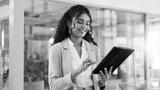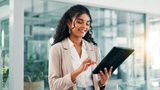 App, smile and tablet with business woman in office for information, project management, report. Internet, lens flare and review with happy employee in professional workplace for company development