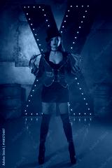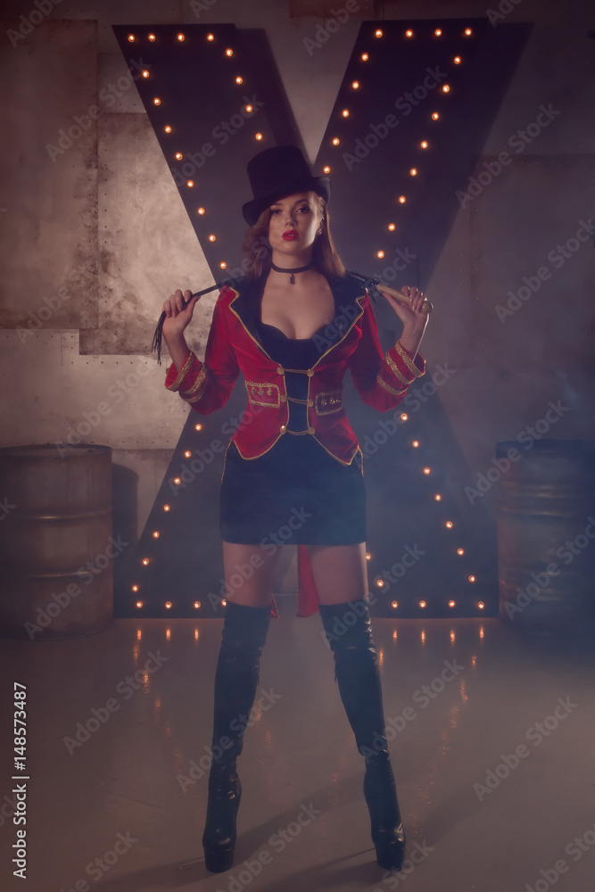 Beautiful woman trainer in a circus suit