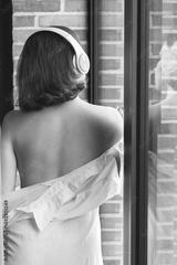 Back view of beautiful сaucasian woman in headphones enjoying listening music standing, leaning back on window.