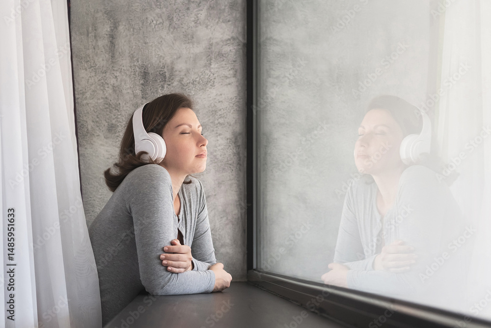 Portrait of beautiful сaucasian young woman in headphones closing eyes dreaming, enjoying listening music standing near big panoramic window of apartments.