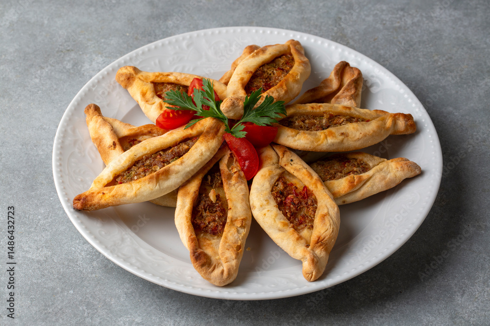 Dishes from traditional Turkish cuisine; Mini pita with minced meat - Turkish name; Kiymali mini pide