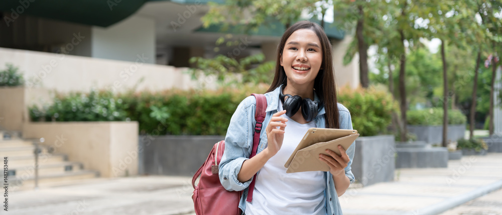 Beautiful student asian woman with backpack and books outdoor. Smile girl happy carrying a lot of book in college campus. Portrait female on international Asia University. Education, study, school