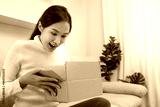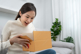 Pretty asian woman feel surprise and look interest inside presents box. cute girl excited open gift box. birthday, Celebration, xmas, New year Festival, thank, Celebrate, Valentine's Day, Anniversary