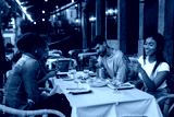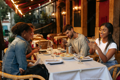 Friends using smart phones while having dinner at restaurant