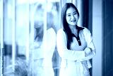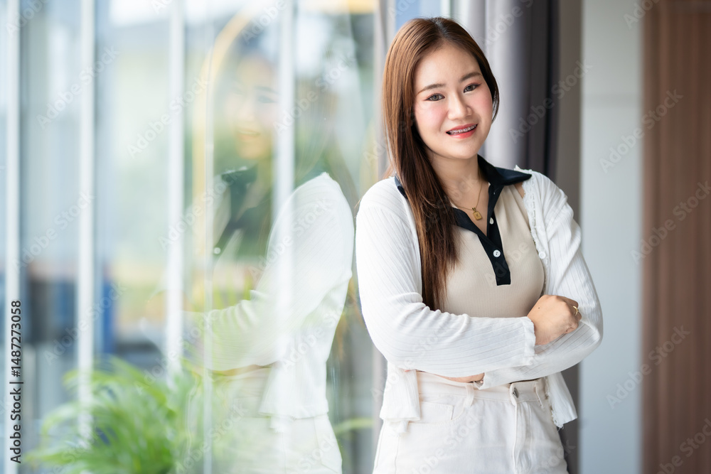 Portrait of beautiful happy Smiling asian woman relaxing sitting in cafe interior in coffee shop background