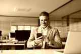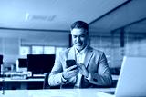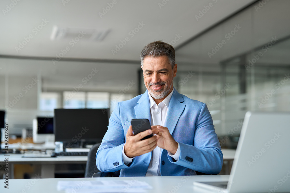 Smiling mature older business man using mobile phone at work. Happy mid aged businessman investor executive looking at smartphone texting in app checking finance banking market on cellphone.