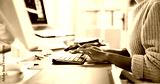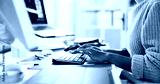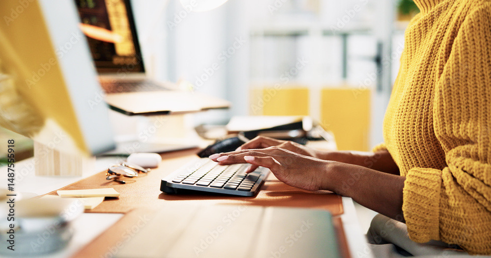 Hands, typing and computer for research, copywriting or editing newsletter at office desk. Person, writer or editor with desktop keyboard for creative website, social media or email for news business
