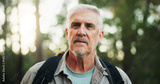 Serious, hiking and senior man in forest, journey and adventure in nature, traveller or retirement. Backpacking, outdoor and elderly person on holiday in woods, trekking or exploration of environment