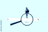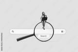 Art collage. A young woman with a laptop is sitting on a big magnifying glass. Isolated free search area. Searching for information on the internet concept.